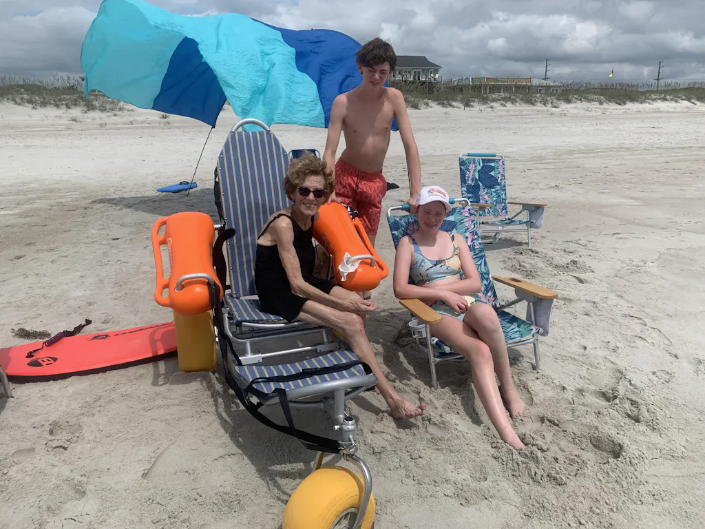 Beach access for sixteen year Parkinson’s patient accomplished due to purchase of Mobi-Chair . Purchased beach front house at Topsail Beach N.C. to help wife enjoy the ocean and beach she loved before Parkinson . Access became impossible due to the progression of the disease . MobiChair has got us back on the beach for the fall . Mission accomplished !